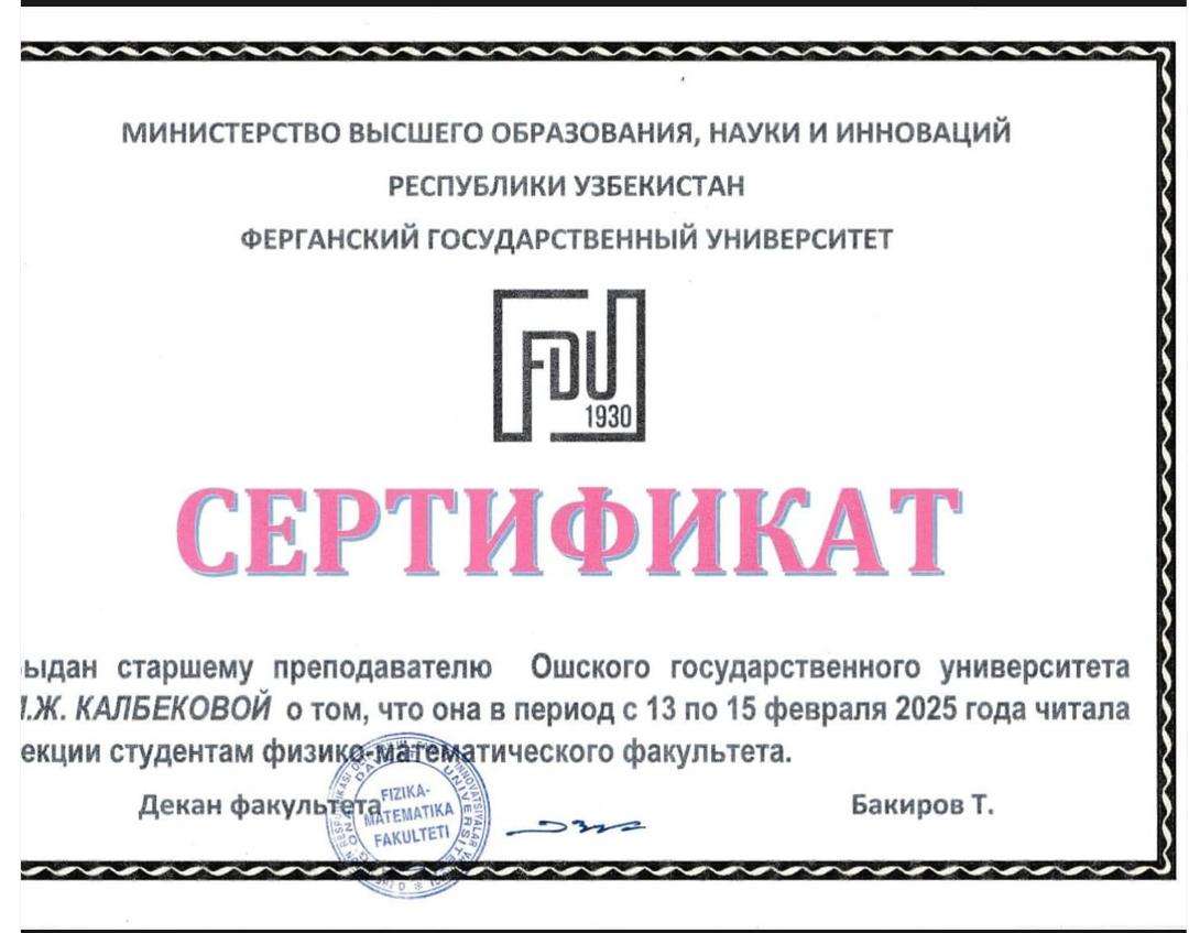 2024-2025-окуу жылынын 23-апрелинен 30-апрелине чейин Ош мамлекеттик университетинин МФТИТ институтунун Жалпы физика жана ФОУ кафедрасынын окутуучулары ф.-м.и.к. Калбекова М.Ж., Макамбаева Ж.А, Молдоярова Ж.Б жана 550200 ФМББ. багытынын 1-курстарынын магистранттары, Кубатбек к У., Апсаматова Т.А. жана ФЕ(б)-1-23 тайпасынын студенттери, Абдиллаева Ш., Зергербаева Д.А. 510400 "Физика" багытынын 1-курсунун магистранты Шарипова Г.К. мобилдүүлүк боюнча Фергана мамлекеттик университетинин чакыруусу менен барып, физика кафедрасында окутуучуларына жана студенттерине конок лекцияларды окуп, сабактарга катышышып маалымат алмашып келишти.